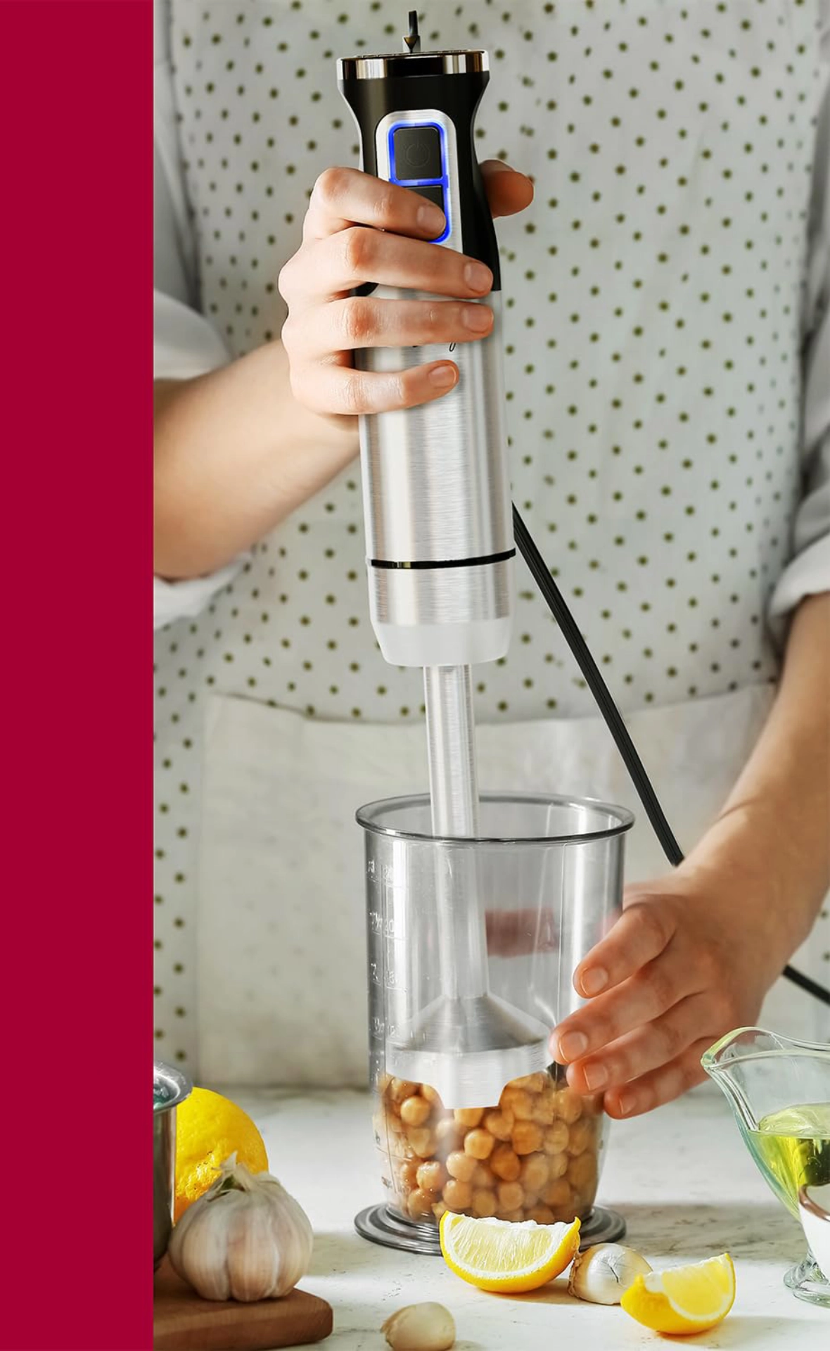 Versatile stainless steel hand blender with 8 speeds and turbo mode. Perfect for soups, smoothies, purees, and sauces with powerful blending performance.