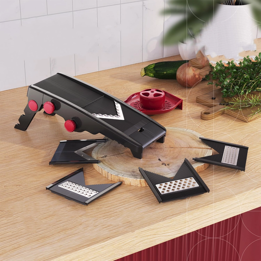 Durable and adjustable mandoline slicer for vegetables, fruits, cheese, and potatoes. Ideal for quick, precise slicing and grating in everyday meal prep.